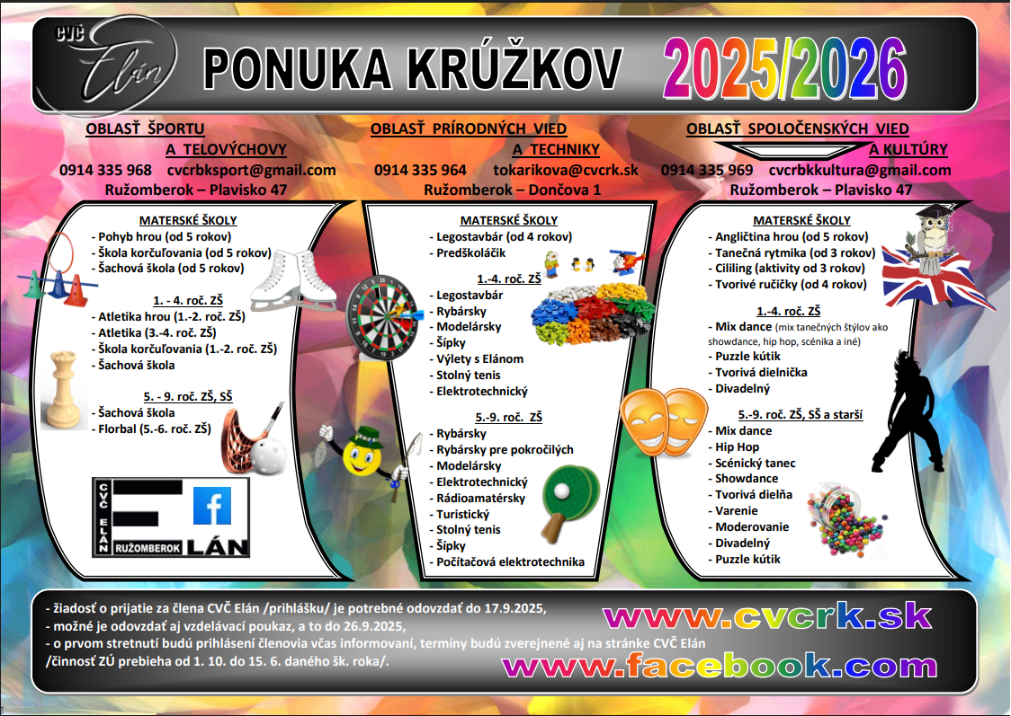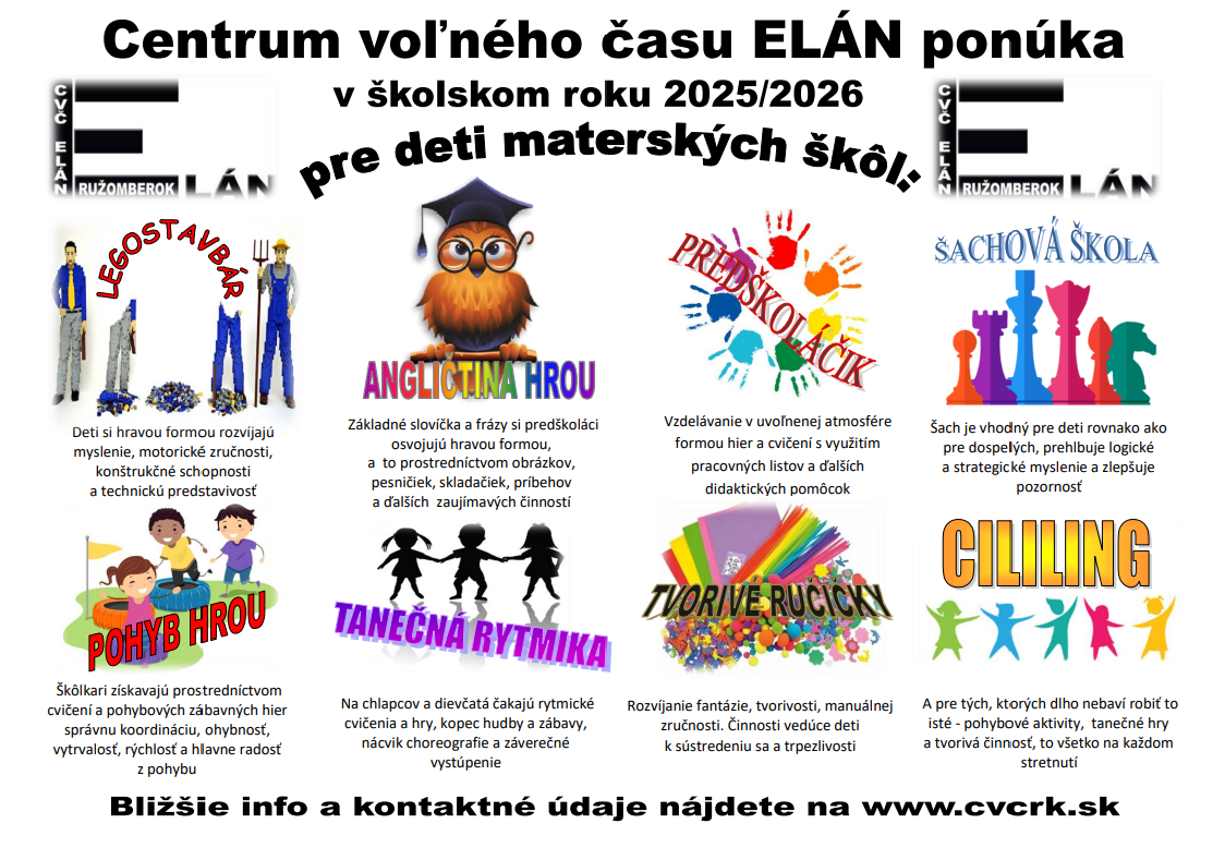 Nižšie nájdete pestrú ponuku záujmových krúžkov mestského CVČ ELÁN Ružomberok.