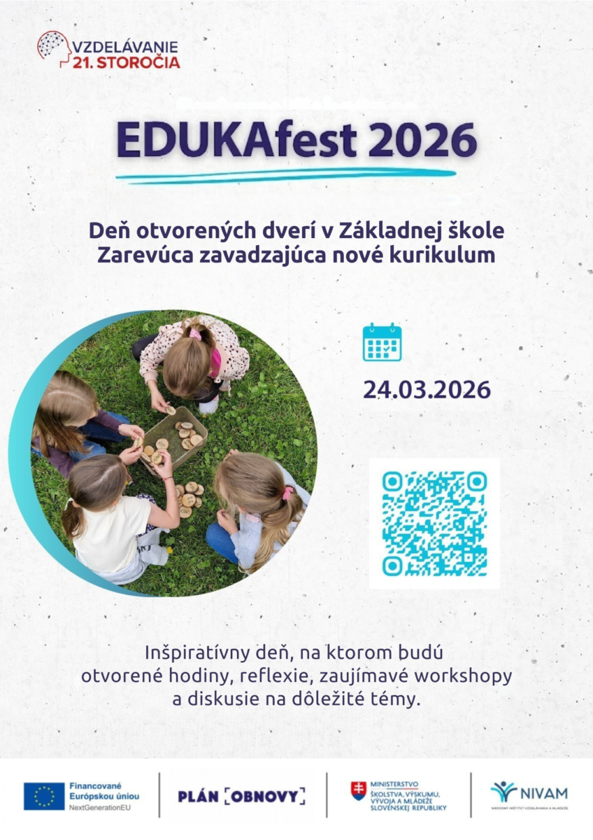 Už 24. marca sa uskutoční tretí ročník EDUKAfestu – Deň otvorených dverí v školách, ktoré vyučujú podľa nového štátneho vzdelávacieho programu. Počas jedného dňa sa po celom Slovensku otvoria dvere 30 základných škôl a umožnia učiteľkám a učiteľom vidieť kurikulárne zmeny priamo v praxi. Navštíviť v tento deň môžete aj Základnú školu Zarevúca, ktorá zavádza nové kurikulum.