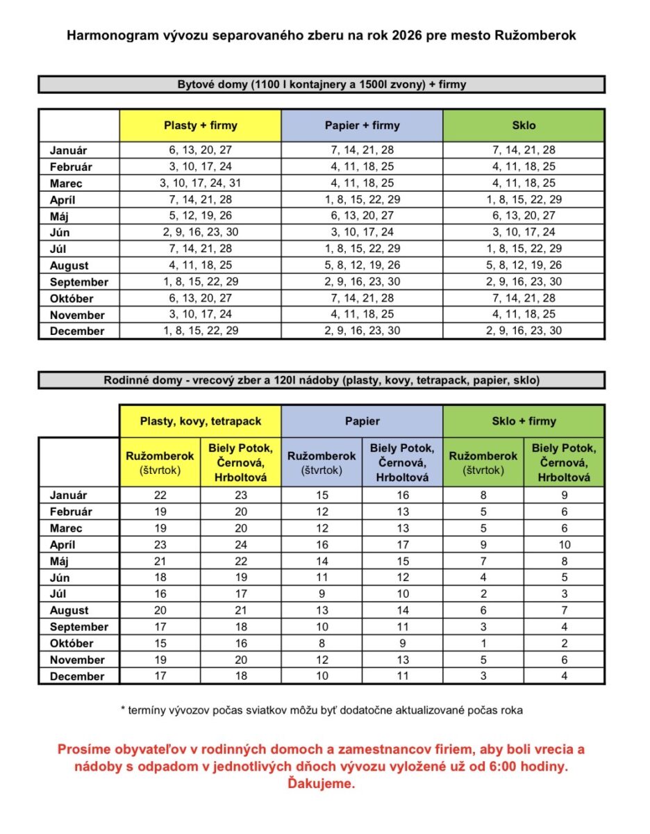 Termíny vývozu počas sviatkov môžu byť dodatočne aktualizované aj počas roka. Prosíme obyvateľov v rodinných domoch a zamestnancov firiem, aby boli vrecia a nádoby s odpadom v jednotlivých dňoch vývozu vyložené už od 6.00 hod.