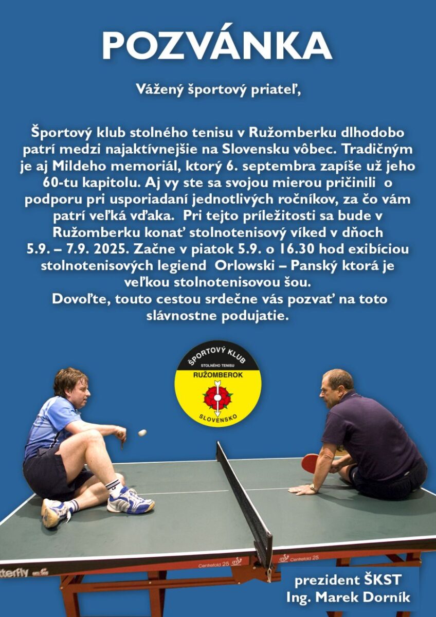 STOLNOTENISOVÝ VÍKEND: 60. MILDEHO MEMORIÁL A EXHIBÍCIA ORLOWSKI – PANSKÝ (Športová hala Koniareň)