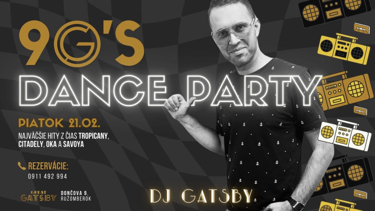 Pripravte sa na návrat do najlepšej éry tanečnej hudby. DJ Gatsby vám namixuje tie najväčšie hity 90. rokov, ktoré ovládli kluby, rádiá aj MTV. Čakajú vás rytmy, ktoré vás nenechajú sedieť a prinesú vlnu nostalgie priamo na parket. Spomínate si na časy Tropicany, Citadely, Oka či Savoya? Tak presne túto atmosféru zažijete opäť v Great Gatsby. Pripravte sa na poriadnu tanečnú noc. Vytiahnite svoje tanečné kroky a poďte s nami zažiť noc plnú hitov, ktoré nikdy neomrzia.