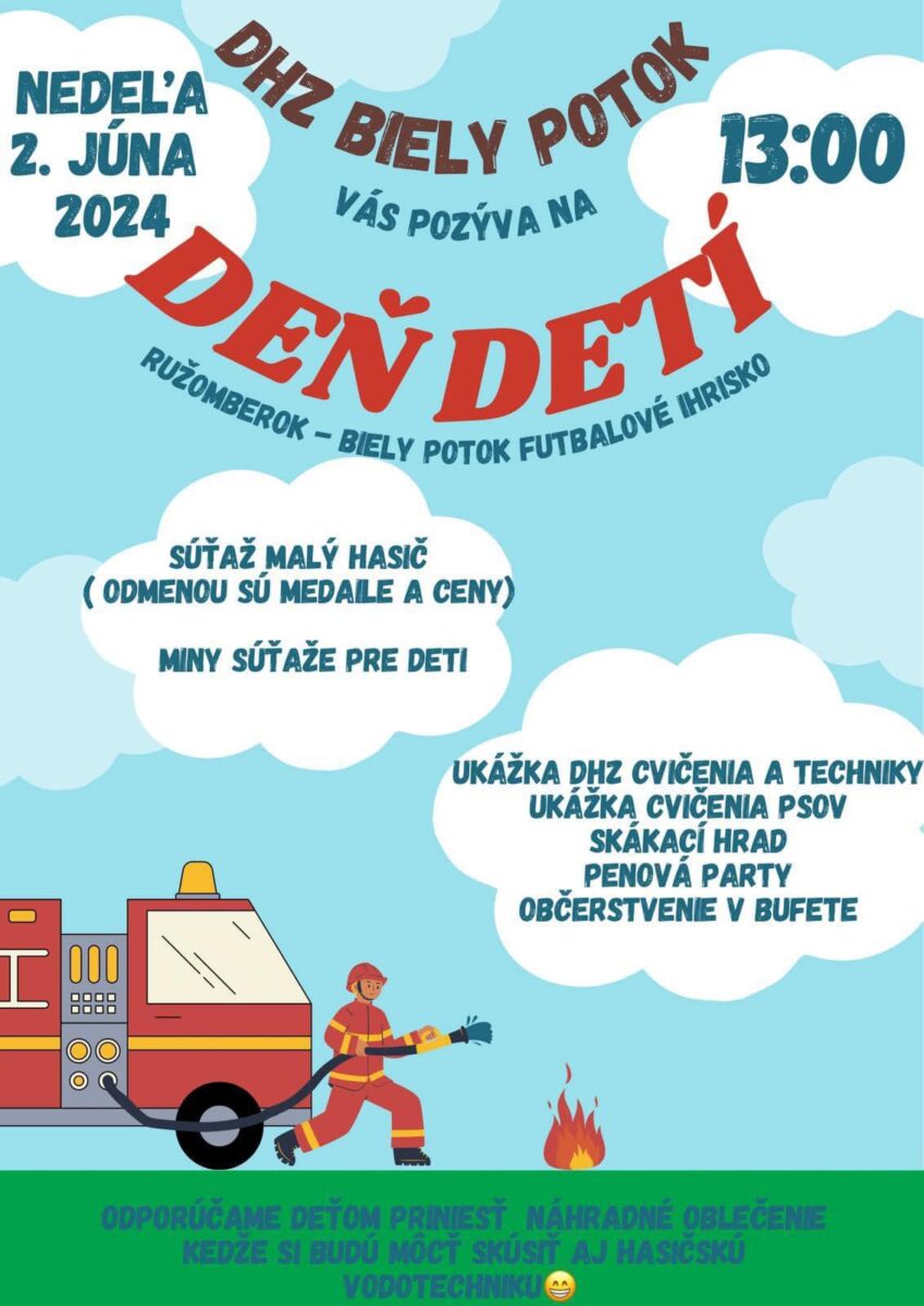 Dobrovoľný hasičský zbor Biely Potok pozýva všetky deti a rodičov osláviť Deň detí.