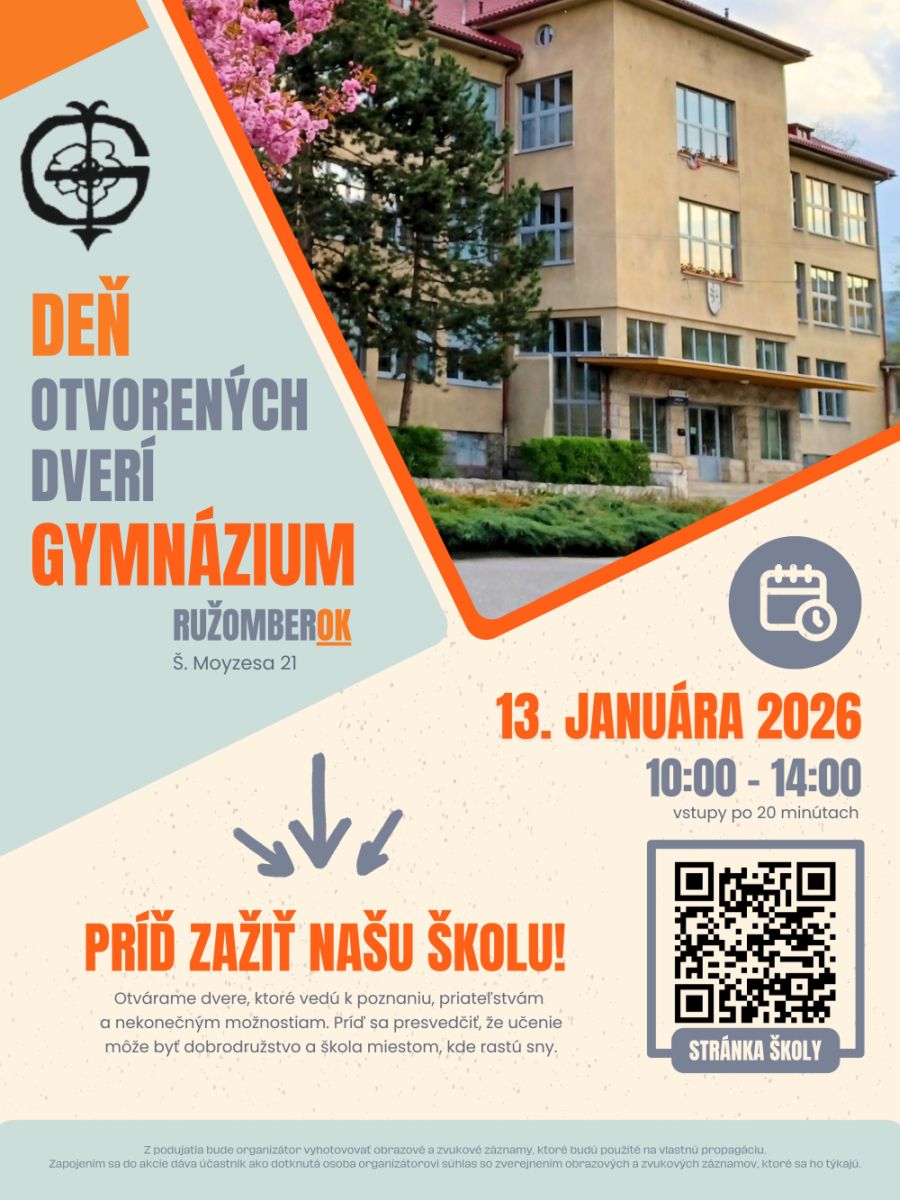 Gymnázium v Ružomberku srdečne pozýva žiakov 5. a 9. ročníkov základných škôl, rodičov, učiteľov, výchovných poradcov, záujemcov a priateľov školy na Deň otvorených dverí.
