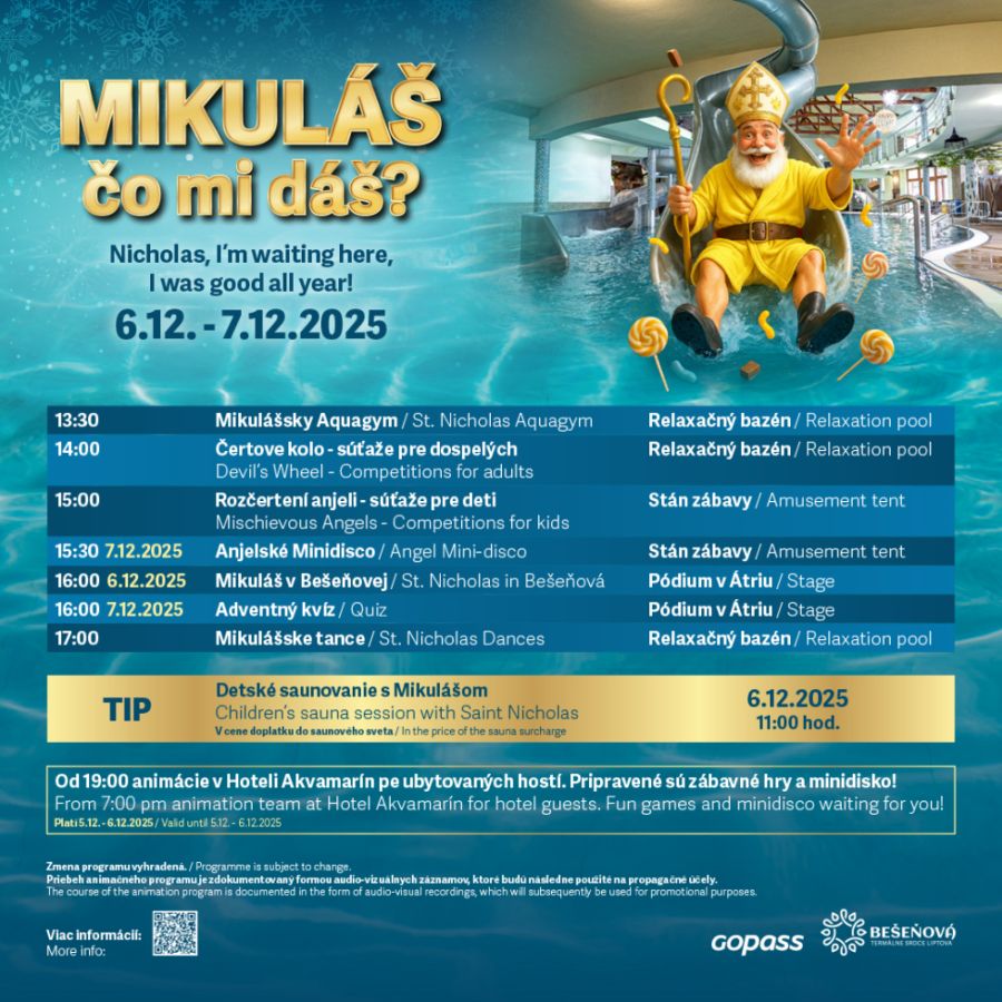 6.12. sa deti môžu tešiť na Mikuláša a na sladkú odmenu za básničku alebo pesničku, rodičia na termálnu pohodu a všetci spolu na veselý animačný program vo vode aj mimo nej.