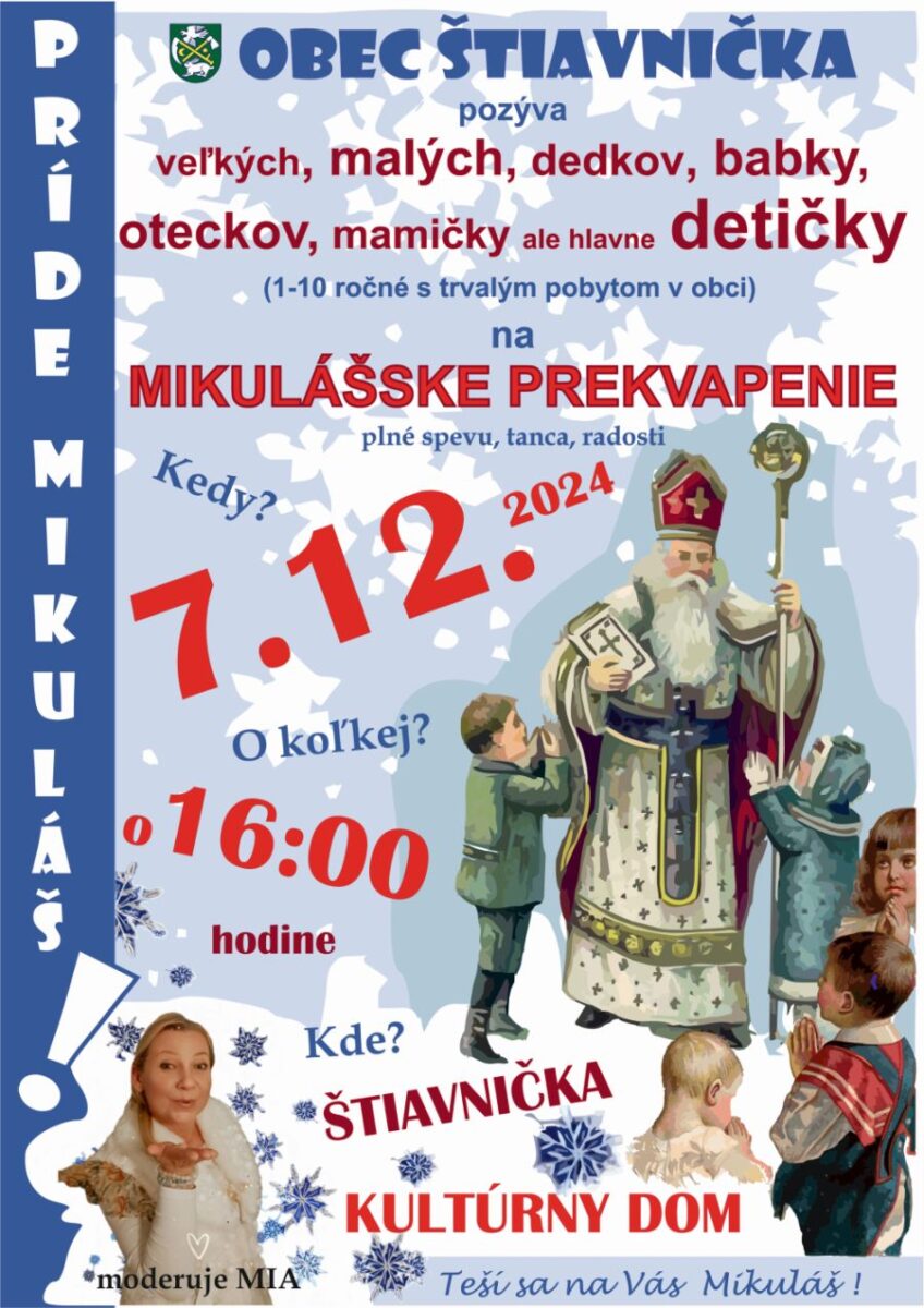 Obec Štiavnička pozýva veľkých, malých, dedkov, babky, oteckov, mamičky, ale hlavne detičky (1 – 10 ročné s trvalým pobytom v obci Štiavnička) na Mikulášske prekvapenie plné spevu, tanca a radosti.