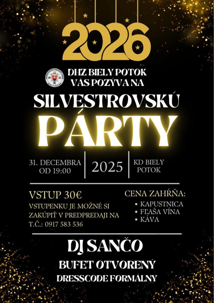 Dobrovoľný hasičský zbor Biely Potok vás pozýva na Silvestrovskú párty.