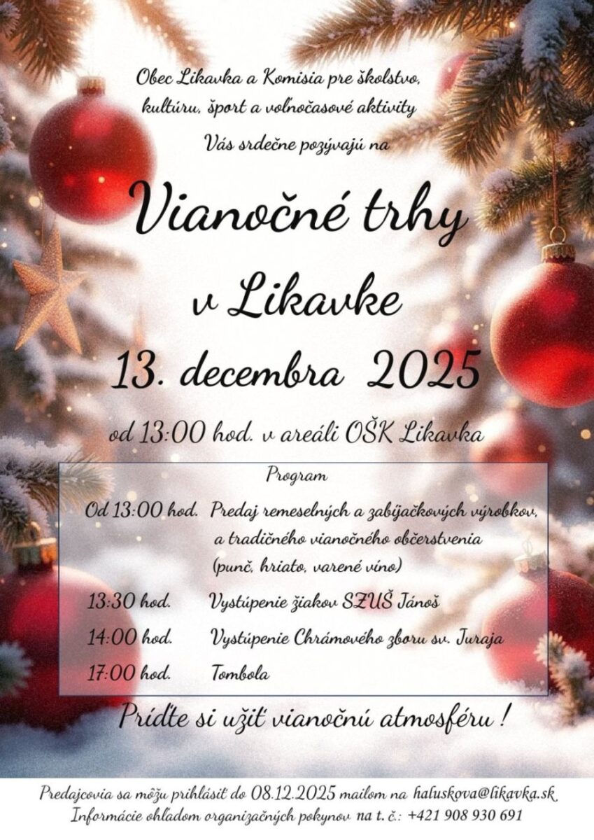 Predajcovia sa môžu prihlásiť do 08.12.2025 e-mailom na: haluskova@likavka.sk