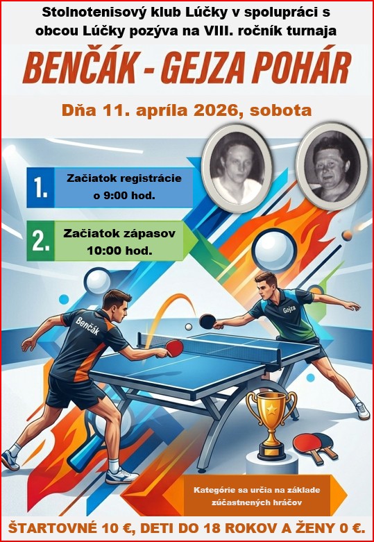Stolnotenisový klub Lúčky v spolupráci s Obcou Lúčky pozýva všetkých priaznivcov stolného tenisu na VIII. ročník stolnotenisového turnaja Benčák – Gejza Pohár.