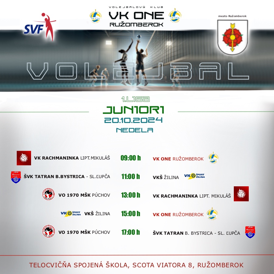 Volejbalový klub VK ONE Ružomberok organizuje volejbalový turnaj, na ktorom sa odohrajú zápasy 2. kola 1. ligy juniorov vo volejbale.