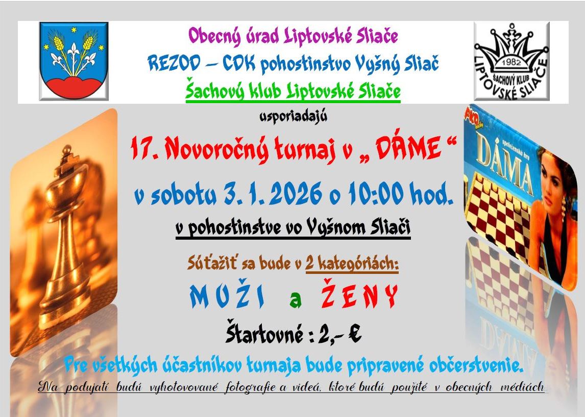Obec Liptovské Sliače a Šachový klub Liptovské Sliače organizujú XVII. ročník Novoročného turnaja v dáme.
