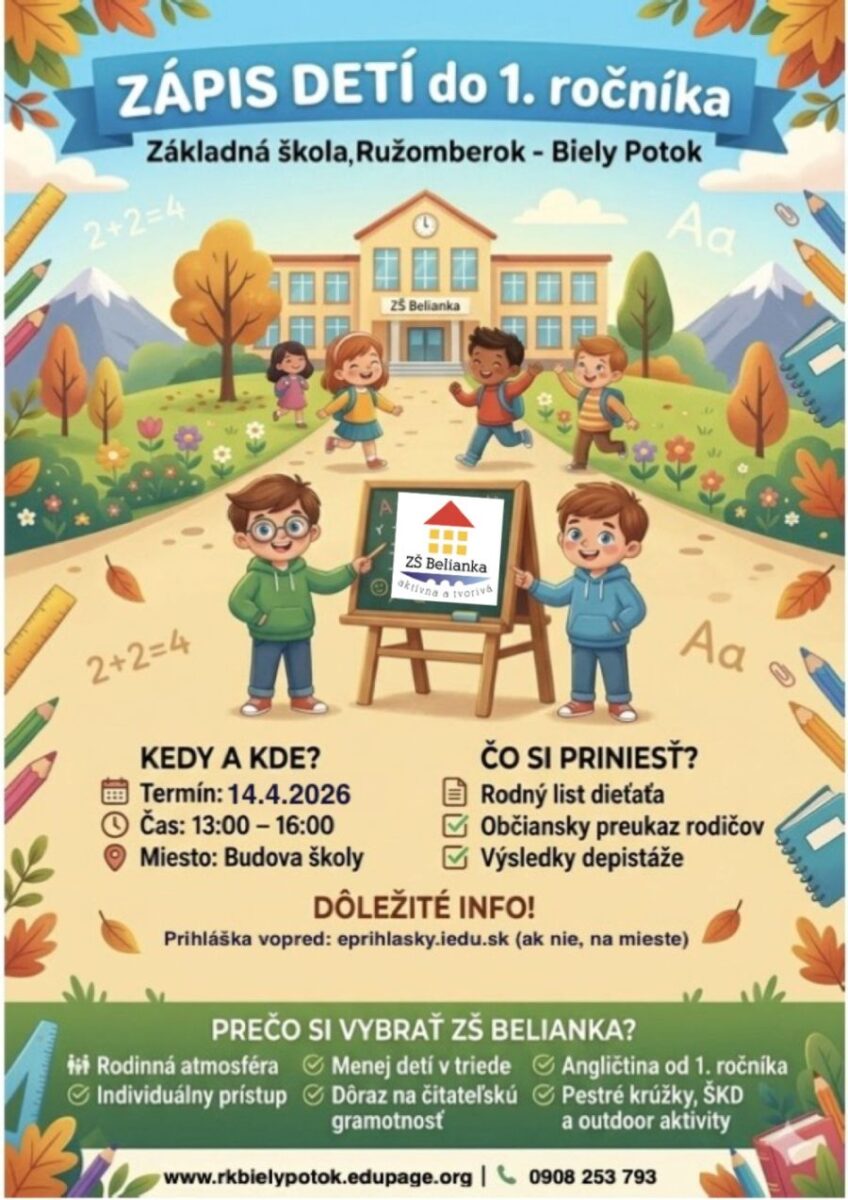 Základná škola Základná škola Ružomberok – Biely Potok organizuje Zápis detí do 1. ročníka.